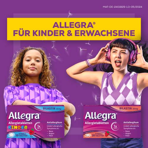 Allegra® Allergietabletten Kinder 10 mg Schmelztabletten. Wirkstoff: Bilastin. Anwendungsgebiet: Antihistaminikum. Zur Linderung der Beschwerden allergischer Rhinokonjunktivitis und Urtikaria bei Kindern im Alter von 6-11 Jahren mit einem Körpergewicht von mind. 20 kg. Apothekenpflichtig. Zu Risiken und Nebenwirkungen lesen Sie die Packungsbeilage und fragen Sie Ihre Ärztin, Ihren Arzt oder in Ihrer Apotheke.