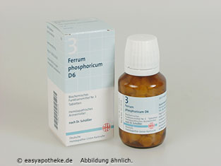 Die Biochemie DHU 3 Ferrum phosphoricum D 6 Tabletten. Die Tabletten enthalten den homöopathischen Wirkstoff Eisenphosphat.