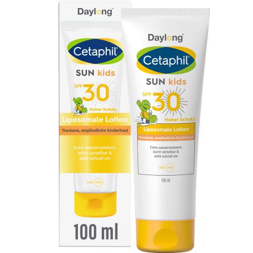 Cetaphil Sun Daylong Kids Liposomale Lotion SPF 30 ist ein dermatologischer Sonnenschutz speziell für die besonderen Ansprüche von empfindlicher Baby- und Kinderhaut (auch bei Neurodermitis geeignet). Die photostabilen UV-Filter bieten einen hochwirksamen und sofortigen UVA- und UVB-Schutz und beugen sonnenbedingten Hautschäden1 vor. Die Sonnencreme mit hohem Lichtschutzfaktor ist frei von Duftstoffen und extra wasserfest in Süß- und Salzwasser. Dank ihrer liposomalen Eigenschaften zieht sie schnell ein, klebt nicht und ist leicht verteilbar. 98% der Konsumenten empfehlen Cetaphil Sun Daylong Kids weiter.2