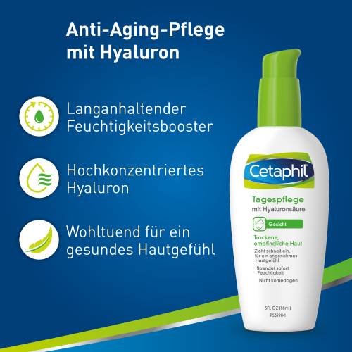 Die spezielle Formulierung der Cetaphil Tagespflege mit einer Kombination aus hochwertigen Feuchtigkeitsspendern wie Hyaluronsäure, Glycerin und Aqualance™ versorgt trockene, empfindliche Gesichtshaut umgehend mit intensiver Feuchtigkeit. Die Creme zieht schnell ein und hinterlässt ein angenehmes Hautgefühl ohne Spannung. Cetaphil Tagespflege mit Hyaluronsäure ist auch als Make-up Grundlage geeignet. Sie verzichtet auf Duftstoffe und ist nicht komedogen. 90% der Verwender würden Cetaphil Tagespflege mit Hyaluronsäure weiterempfehlen1.