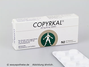 Die Copyrkal Tabletten werden zur schnellen und zuverlässigen Behandlung von leichten bis mittelschweren Schmerzen und Fieber angewendet. Die Tabletten enthalten eine Kombination der beiden Wirkstoffe Paracetamol und Coffein. Das Paracetamol verfügt über schmerzstillende und fiebersenkende Eigenschaften. Das Coffein ist in der Lage die Wirkung des Paracetamols zu verstärken und den Wirkeintritt zu beschleunigen. Die Copyrkal Tabletten sorgen gleichzeitig für eine Anregung des Kreislaufs, wodurch es vorrübergehend zu einer Steigerung der Leistungsfähigkeit kommt.