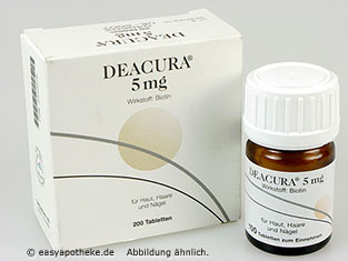 Die Deacura 5 mg Tabletten werden zum Ausgleich eines Biotin-Mangel und zur Kräftigung von Haaren und Nägeln angewendet. Die Tabletten enthalten den Wirkstoff Biotin, welcher zur Gruppe der B Vitamine gehört. Das Biotin erfüllt eine wichtige Rolle im Stoffwechselgeschehen. Der Wirkstoff ist unter anderem am Auf- und Abbau von Kohlenhydraten, Fettsäuren und Aminosäuren beteiligt. Durch einen Biotin-Mangel kann es unter anderem zu Hauterkrankungen, Haarausfall, Appetitverlust, Müdigkeit und Muskelschmerzen kommen. Gründe für einen Biotin-Mangel können zum Beispiel Mangelernährung oder eine Störung der Darmflora sein. Die Einnahme der Deacura 5 mg Tabletten wird bei chronischen Darmerkrankungen, übermäßigem Alkoholkonsum und Störungen der Darmflora empfohlen.