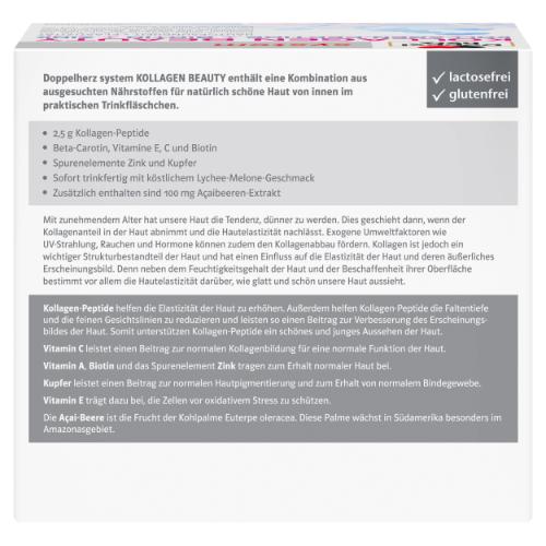 Doppelherz system KOLLAGEN BEAUTY enthält eine Kombination aus ausgesuchten Nährstoffen für natürlich schöne Haut von innen im praktischen Trinkfläschchen. Ein Trinkfläschchen enthält 2,5 g Kollagen-Peptide, Beta-Carotin, Vitamine E, C, Biotin sowie die Spurenelemente Zink und Kupfer. Zusätzlich sind in einem Trinkfläschchen 100 mg Açaibeeren-Extrakt enthalten. Die aufeinander abgestimmten Nährstoffe sind sofort trinkfertig mit köstlichem Lychee-Melone-Geschmack. Mit zunehmendem Alter hat unsere Haut die Tendenz, dünner zu werden. Dies geschieht dann, wenn der Kollagenanteil in der Haut abnimmt und die Hautelastizität nachlässt. Exogene Umweltfaktoren wie UV-Strahlung, Rauchen und Hormone können zudem den Kollagenabbau fördern. Kollagen ist jedoch ein wichtiger Strukturbestandteil der Haut und hat einen Einfluss auf die Elastizität der Haut und deren äußerliches Erscheinungsbild. Denn neben dem Feuchtigkeitsgehalt der Haut und der Beschaffenheit ihrer Oberfläche bestimmt vor allem die Hautelastizität darüber, wie glatt und schön unsere Haut aussieht. Kollagen-Peptide helfen die Elastizität der Haut zu erhöhen. Außerdem helfen Kollagen-Peptide, die Faltentiefe und die feinen Gesichtslinien zu reduzieren und
