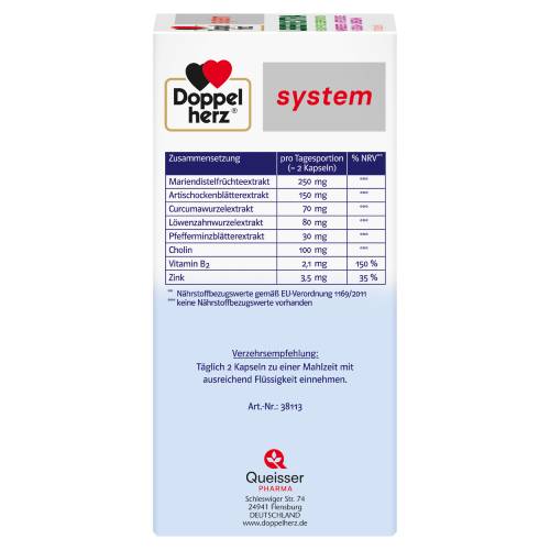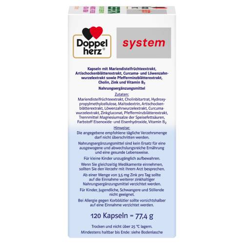Die Leber erfüllt zahlreiche Aufgaben im Stoffwechsel. Als zentrales Stoffwechselorgan spielt sie zum Beispiel eine Rolle bei der Verwertung von Nährstoffen, bei der Regulierung des Fettstoffwechsels und bei der Produktion der Gallenflüssigkeit. Eine fettreiche Ernährung und mangelnde Bewegung können unsere Leber, andere Verdauungsorgane und unseren Stoffwechsel belasten. Für eine gesunde Leber und Verdauung ist eine fettarme und ausgewogene Ernährung, die unseren Körper ausreichend mit Nährstoffen versorgt, wichtig. Das in Doppelherz system LEBER EXTRA enthaltene Cholin leistet einen Beitrag zu einem normalen Fettstoffwechsel und trägt zu einer normalen Leberfunktion bei. Die Verwendung von Mariendistel, Artischocke, Curcuma sowie Pfefferminze geht auf eine lange Tradition zurück. Löwenzahn (Taraxacum officinale) gehört zur Familie der Korbblütler und hat inzwischen unter anderem als Bestandteil von Pesto, Marmelade und Salat Einzug in die Küche gefunden. Zink leistet einen Beitrag zu einem normalen Fettsäurestoffwechsel und trägt außerdem dazu bei, die Zellen vor oxidativem Stress zu schützen. Zink leistet darüber hinaus einen Beitrag zu einem normalen Kohlenhydrat-, Vitamin A- und Säure-Basen-Stoffwechsel. Vitamin B2 trägt zu einem normalen Energiestoffwechsel bei und leistet zudem einen Beitrag zur Verringerung von Müdigkeit und Ermüdung. Täglich 2 Kapseln zu einer Mahlzeit mit ausreichend Flüssigkeit unzerkaut einnehmen.