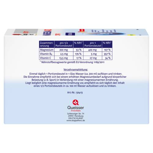 Die Portionsbeutel von Doppelherz system tragen mit 400 mg Magnesium in Citratform zu einer normalen Muskelfunktion und mit Vitamin B6 zur normalen Funktion des Nervensystems bei.