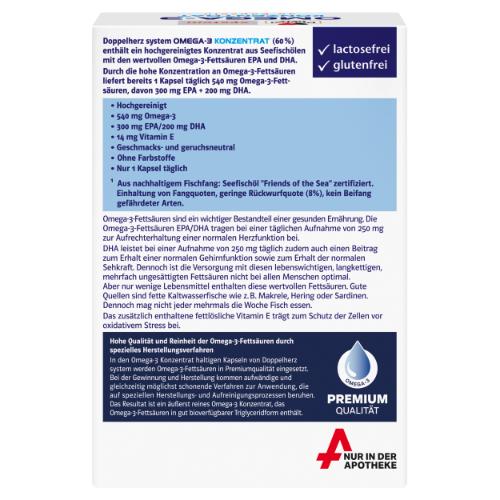 Die Doppelherz system-Kapseln enthalten 900 mg Omega-3-Konzentrat aus Seefischölen, das 60 % an Omega-3-Fettsäuren enthält.