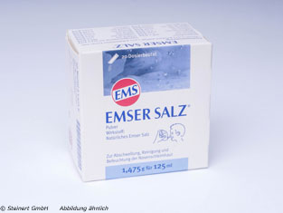 Emser Salz lässt einen akuten und chronischen Schnupfen schneller abklingen und fördert die Genesung nach Operationen an den Nasennebenhöhlen. Es ist ein Gemisch aus vielen verschiedenen Salzen, wie z.B. Natrium, Kalium, Magnesium, Calcium oder Chlorid. Diese Salzmischung hilft die Schleimhautoberfläche der Nase feucht zu halten und zähes Sekret auf zu lösen. Außerdem lässt sie die winzigen Härchen im Riechorgan schneller schlagen, so dass sie den dickflüssigen Auswurf oder schädliche Erreger rascher abtransportieren.