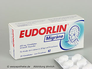 Die Eudorlin Migräne Filmtabletten werden zur schnellen Behandlung von Migräneanfällen angewendet. Die Filmtabletten enthalten 400 mg des Wirkstoffes Ibuprofen. Während einer Migräne-Attacke kommt es immer zu einer Freisetzung von Prostaglandinen. Die Prostaglandine setzen Entzündungsreaktionen in Gang. Durch die Entzündung werden dann die empfindlichen Nervenenden der Gefäße gereizt, wodurch Schmerzsignale an die Schaltzentren im Gehirn gesendet werden. Bei einer Migräne-Attacke kommt es häufig auch zu Brechreiz, Übelkeit, Lichtempfindlichkeit und starkem Schmerzempfinden. Wenn man die Eudorlin Migräne Filmtabletten rechtzeitig einnimmt, hemmen sie die Produktion der Prostaglandine und der Migräneschmerz wird gelindert.