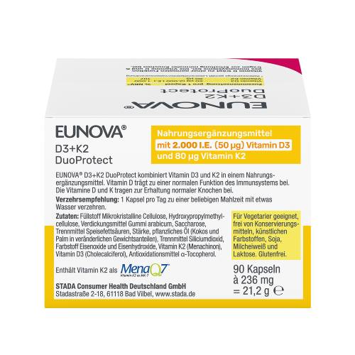 Die Kombination der sich ergänzenden Vitamine D3 und Vitamin K2 in einem Präparat ist im Hinblick auf die Ernährungsphysiologie sinnvoll. EUNOVA® DuoProtect leistet als 2-in-1-Nahrungsergänzungsmittel eine wertvolle Ergänzung zu einer gesunden Ernährung und bewussten Lebensweise.