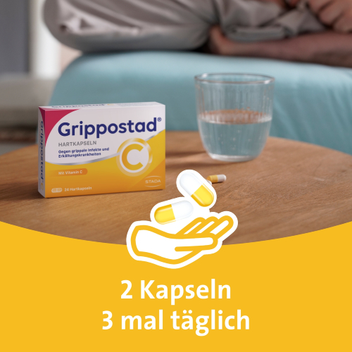 Erkältungen sind meist Virusinfektionen der Atemwege, die sich auf den ganzen Körper auswirken können. Viele Erkältete leiden bei einer Erkältung gleichzeitig an Schnupfen, Kopf- und Gliederschmerzen, Husten und Fieber. Alle diese Erkältungsbeschwerden gemein- sam können mit einem Kombi-Präparat bekämpft werden. Grippostad® C Kapseln sind Deutschlands meistverwendete Erkältungsmedizin bei Erkältungskrankheiten und grippalen Infekten. Sie enthalten eine Kombination aus Paracetamol, Chlorphenaminmaleat, Vitamin C und Coffein. Sie wirken gegen Reizhusten, Erkältungsfieber, Kopf- und Gliederschmerzen und Schnupfen in einem und lindern schnell diese gemeinsam auftretenden Erkältungssymptome. Die Dosierung der Wirkstoffe ist so abgestimmt, dass mit einem Minimum an Wirkstoff ein Maximum an Wirkung erzielt wird. Die Kapseln sind auch für Patienten mit Bluthochdruck, Asthma und Diabetes* geeignet.
