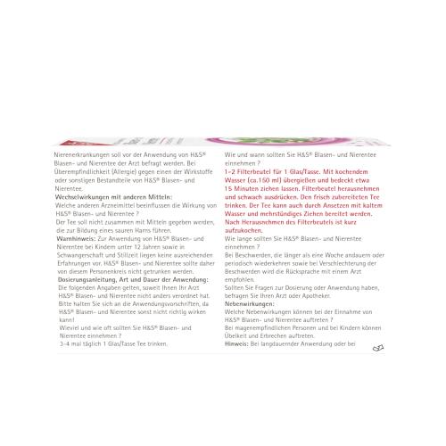 Der H&S Blasen- und Nierentee wird zur natürlichen Behandlung von Beschwerden der Nieren und der ableitenden Harnwege angewendet. Der Tee enthält den wirksamen Inhaltsstoff Schachtelhalm. Schachtelhalm ist in der Lage die Durchspülung der Niere zu unterstützen. Der Pflanzenstoff verfügt über harntreibende und immunstimulierende Eigenschaften. Das Schachtelhalmkraut beinhaltet unter anderem Kieselsäure, Kalium, Carbonsäure, Flavonoide und Glykoside. Der H&S Blasen- und Nierentee hilft bei entzündlichen und bakteriellen Entzündungen der Blase und Niere.