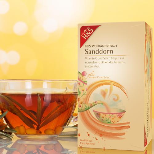 Tassenfarbe: orange Früchte- Kräutertee mit natürlichem Aroma, Vitamin C, Selen und Sanddorngeschmack.