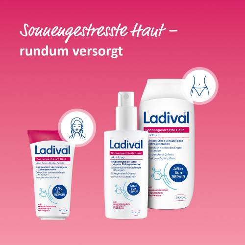 Nach dem Sonnenbaden ist es wichtig, die sonnengestresste Haut optimal zu pflegen und ihre Feuchtigkeitsspeicher aufzufüllen. Sollte Ihre Haut von der Sonne gereizt sein und empfindlich reagieren, verschafft die Ladival® Sonnengestresste Haut Akut-Serie schnell Linderung. Diese wurde speziell für UV-gereizte Haut entwickelt und unterstützt die hauteigene Zellregeneration mit dem Algen-Enzym Photolyase.