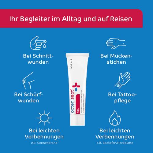 Egal, ob Schürf- , Kratz- und Schnittverletzungen oder leichte Verbrennungen wie Sonnenbrand – octenisept® Gel bietet schnelle Hilfe bei akuten Wunden. Bereits beim Auftragen wird der Schmerz deutlich reduziert. Nach 60 Sekunden bildet sich eine dünne Schutzschicht auf der Wunde, die das Eindringen von Keimen und Bakterien verhindert.