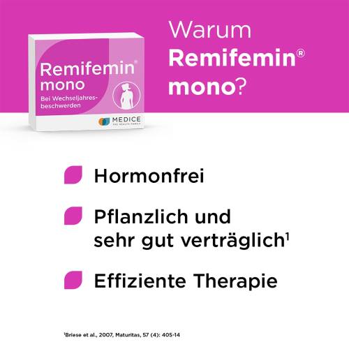 - Remifemin mono : die ideale Empfehlung für Frauen, die ihr Wechseljahrespräparat nur einmal täglich nehmen möchten