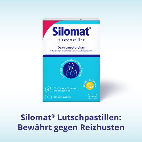 Silomat® Hustenstiller Dextromethorphan mit Zitronen-Geschmack 7,7 mg Lutschpastillen. Zur Anwendung bei Kindern ab 6 Jahren und Erwachsenen Wirkstoff: Dextromethorphanhydrobromid-Monohydrat. Zur symptomatischen Behandlung von Reizhusten. Bei Reizhusten handelt es sich um einen trockenen Husten, bei dem kein Schleim abgehustet wird (unproduktiver Husten). Hinweis: Nicht mehr und nicht länger anwenden als empfohlen. Enthält Maltitol, Cyclodextrin(e) und Levomenthol.