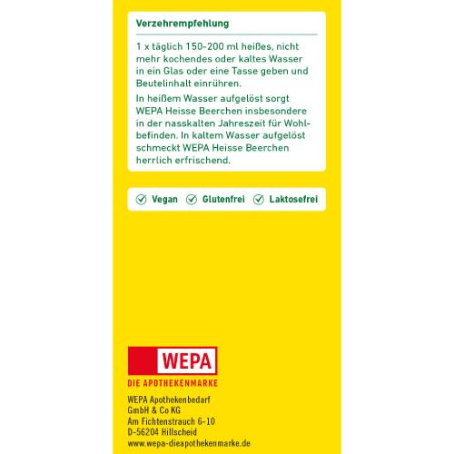 In heißem Wasser aufgelöst sorgt WEPA Heisse Beerchen insbesondere in der nasskalten Jahreszeit für Wohlbefinden. In kaltem Wasser aufgelöst schmeckt WEPA Heisse Beerchen herrlich erfrischend.
