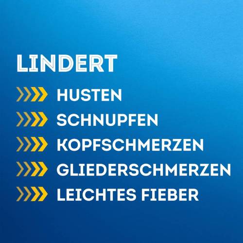 - WIRKSTOFFE: Paracetamol, ein Schmerzmittel zur Linderung von leichtem Fieber, Kopf- und Gliederschmerzen, Dextromethorphanhydrobromid zur Linderung von Husten und Phenylpropanolaminhydrochlorid, ein abschwellendes Mittel gegen Schnupfen