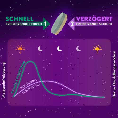 - ZWEI-SCHICHT-TABLETTE HILFT, SCHNELLER EINZUSCHLAFEN¹ & DURCHZUSCHLAFEN². Eine Schicht mit schneller Freisetzung von Melatonin für schnelleres Einschlafen¹, eine Schicht mit verzögerter Freisetzung von Melatonin über 8 Std., die beim Durchschlafen² hilft